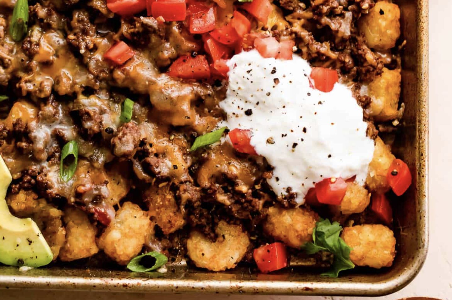 Seasoned 90/10 ground beef smothered in low-calorie creamy cheese sauce, paired perfectly with crispy potatoes. Topped with low-fat sour cream, fresh green onions, and diced Roma tomatoes.